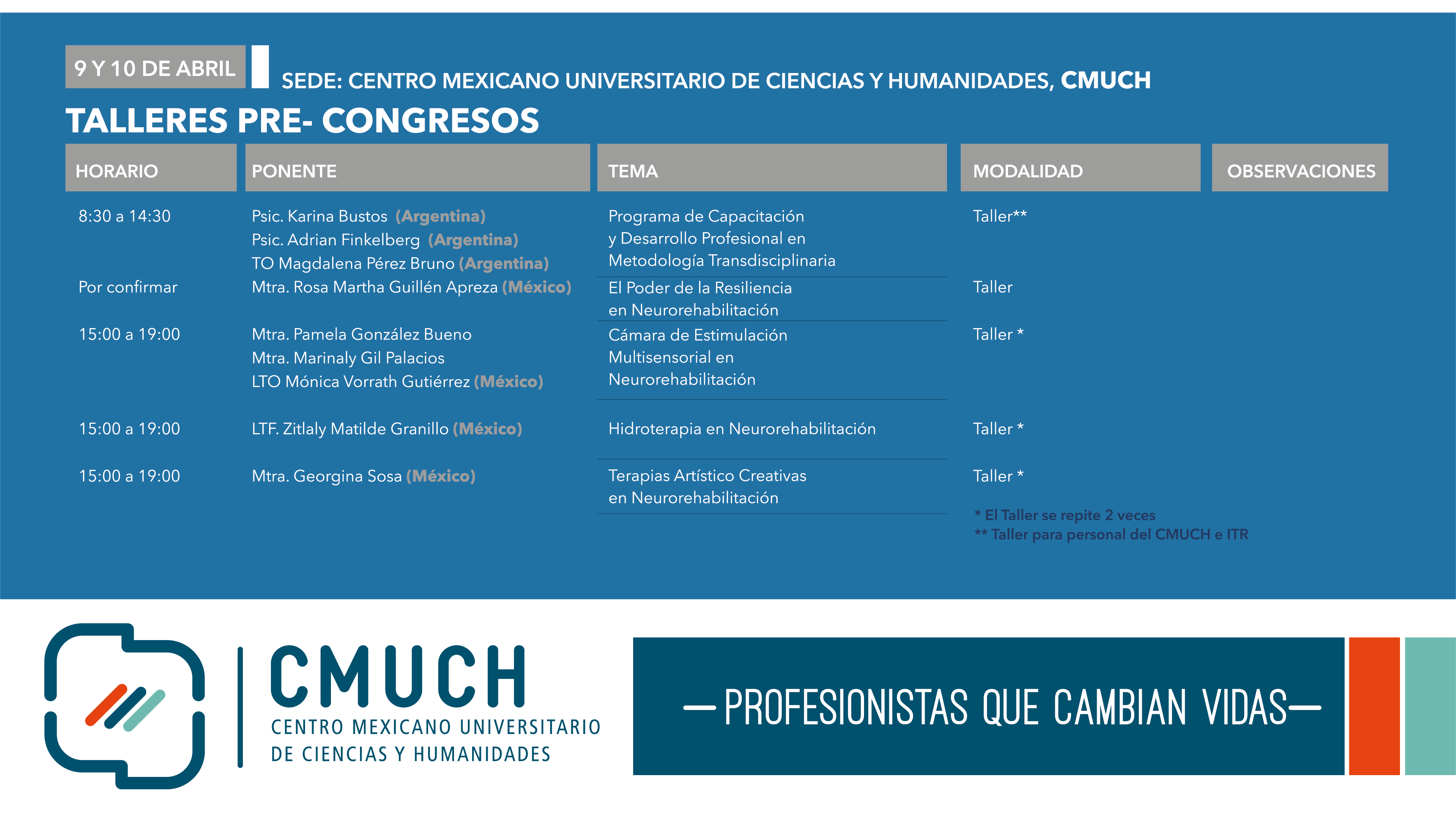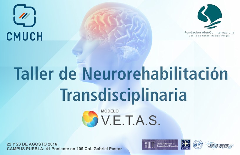 CMUCH se complace en anunciar el TALLER EN NEUROREHABILITACIÓN TRANSDISCIPLINARIA (Modelo VETAS) que Fundación AlunCo Internacional presentará en las instalaciones de CMUCH Campus Puebla los días 22 y 23 de agosto. Nos honrarán con su presencia la Lic. Karina Bustos, la T.O. Magdalena Pérez Bruno, el Lic. Adrián Finkelberg y la Lic. Melisa Godoy. Nuestro alumnado de posgrados e invitados especiales serán beneficiados con los conocimientos de estos especialistas procedentes de Argentina. CMUCH, ¡todo lo que puedes ser!