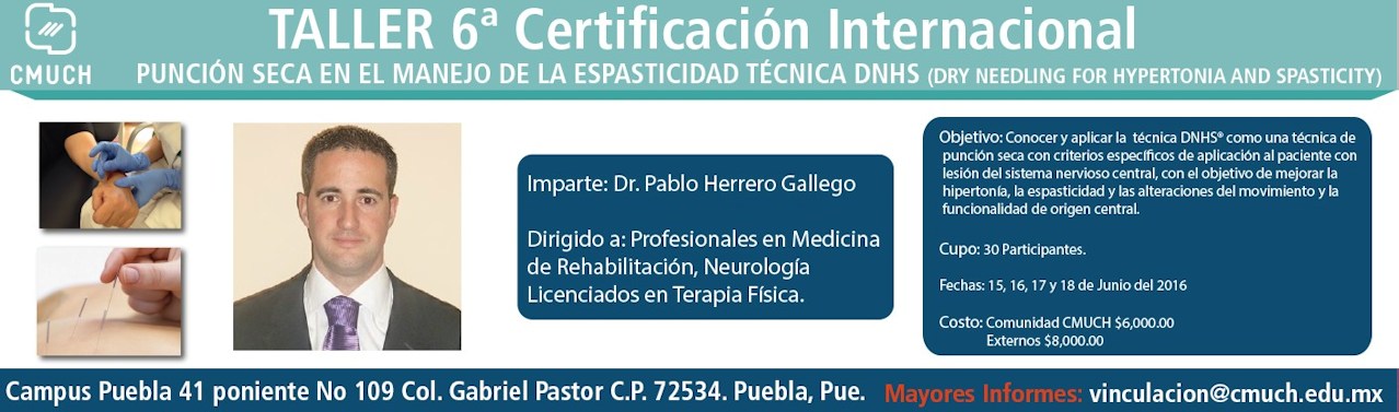 Taller 6ta Certificación Internacional Punción seca en el manejo de la espasticidad técnica DNHS. Imparte: Dr. Pablo Herrero Gallego mas información en vinculacion@cmuch.edu.mx