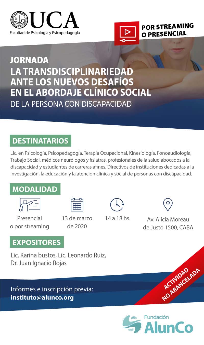 Jornada: La transdisciplinariedad ante los nuevos desafíos en el abordaje clínico social de la persona con discapacidad Informes e inscripción previa: instituto@alunco.org